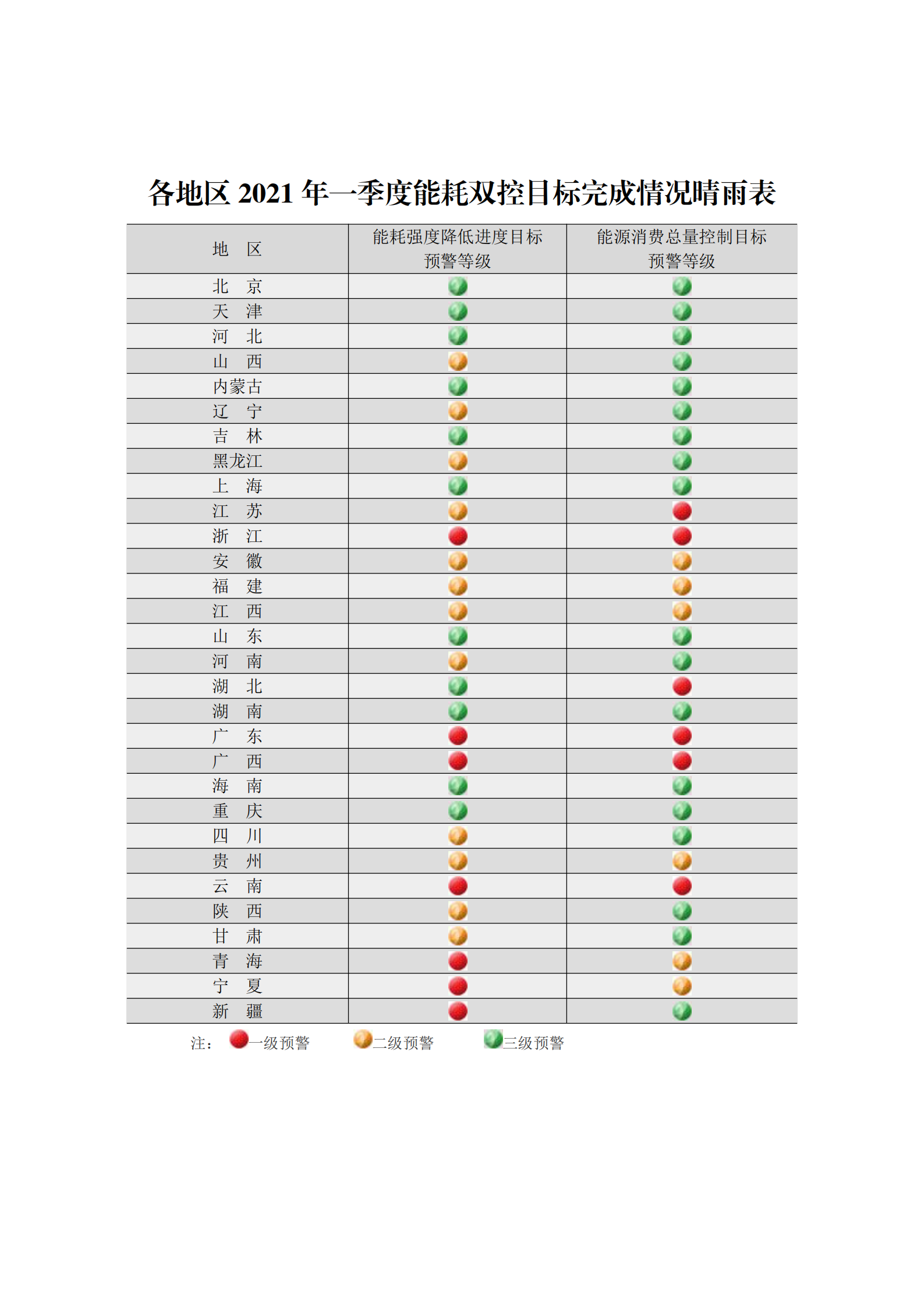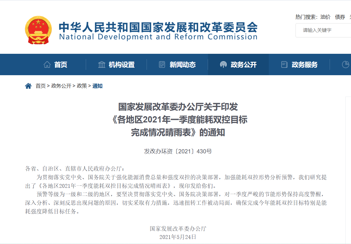 6月3日,據(jù)國(guó)家發(fā)改委官網(wǎng)消息,為加強(qiáng)能耗雙控形勢(shì)分析預(yù)警,國(guó)家發(fā)改委研究提出了《各地區(qū)2021年一季度能耗雙控目標(biāo)完成情況晴雨表》,印發(fā)給各省、自治區(qū)、直轄市人民政府辦公廳。