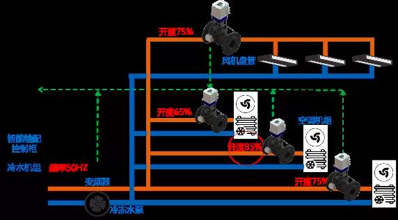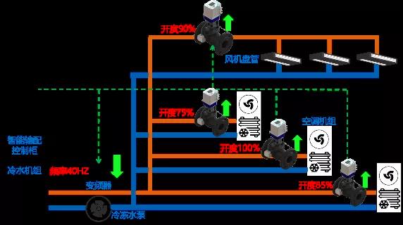 在保證管網(wǎng)動態(tài)平衡控制和末端需求的前提下,通過智慧閥門與水泵轉(zhuǎn)速調(diào)節(jié)耦合聯(lián)動,可同時降低水泵流量、揚程,最大程度發(fā)揮變頻技術(shù)的節(jié)能潛力。