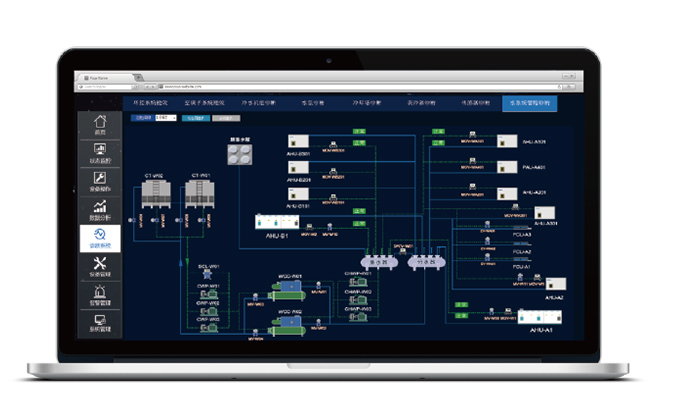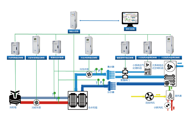 系統(tǒng)由智慧冷凍站、智慧輸配系統(tǒng)和智慧控制系統(tǒng)構(gòu)成,主要從末端用戶負荷需求著手,解決輸配系統(tǒng)水力失調(diào)問題,提高中央空調(diào)系統(tǒng)運行效率,降低設(shè)備運行能耗,實現(xiàn)系統(tǒng)COP最優(yōu)。